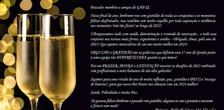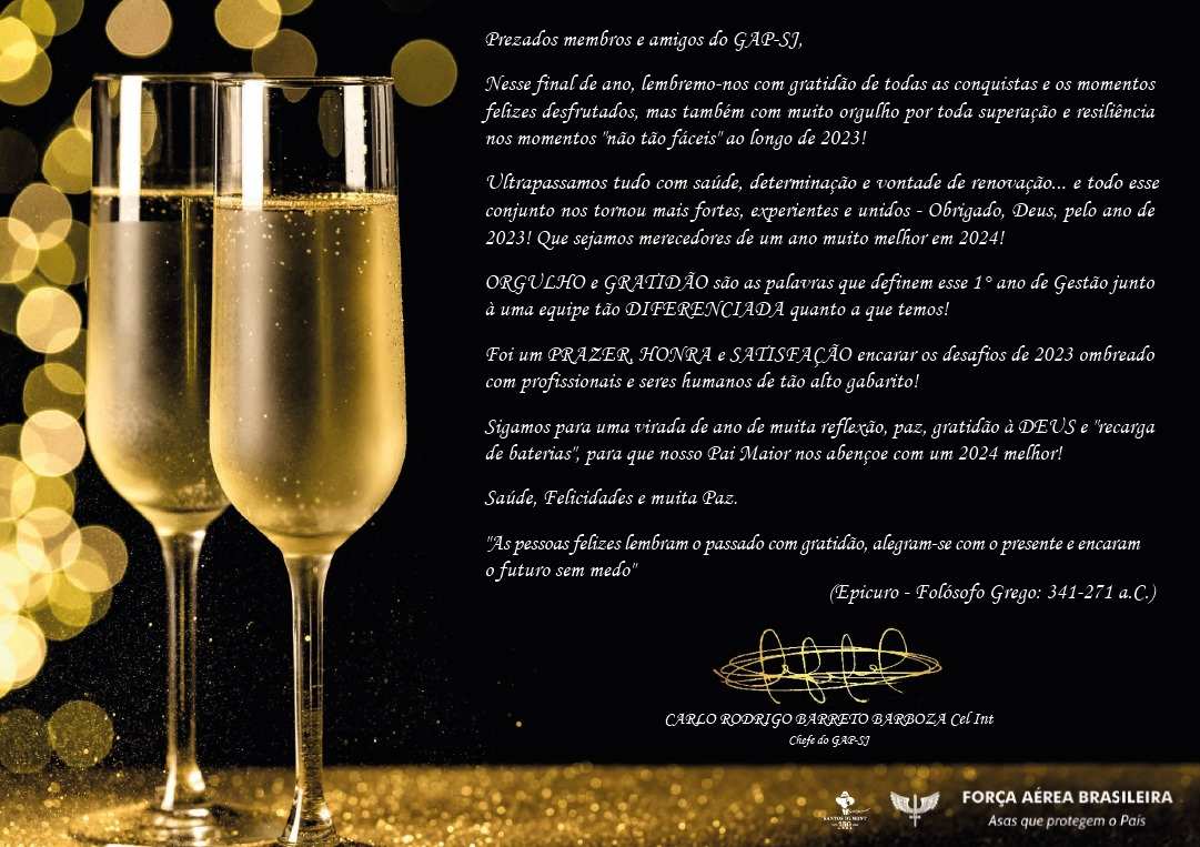 2023 foi um ano ESPECIAL em diversos sentidos... Desafios foram superados, amizades fortalecidas, a coesão e a sinergia aprimoradas e as expectativas superadas!!! Só tenho a agradecer a DEUS, nossas FAMÍLIAS e a TODOS nossos COLABORADORES do GAP-SJ que tornaram e tornam a missão de estar a frente desse Grupo/OM uma satisfação mais pessoal do que profissional.
